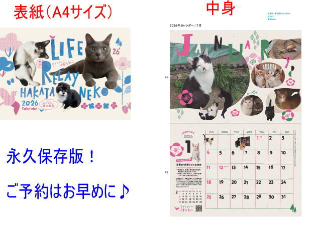 ![]() ![]() 2026年版 LR博多ねこオリジナルカレンダー 予約受付開始しました! 以下の注文フォームよりご注文お願いします。 クリック → https://ws.formzu.net/dist/S10527427/ ![]() ******************************* 地域猫活動というのは、人と人とのつながりそして協力が何より必要です。